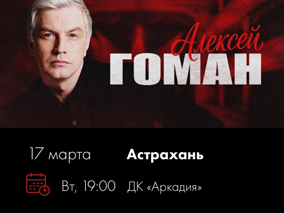 17 Марта 2026 года в Астраханском дворце культуры «Аркадия» состоится концерт Алексея Гомана, одного из самых искренних артистов отечественной сцены.